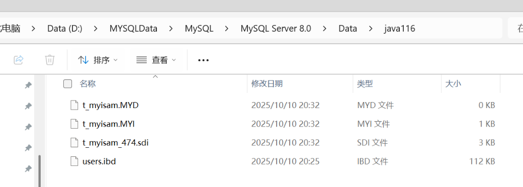 其他就是myisan存储引擎对应的三个文件:MYD中my就代表my D就代表数据
