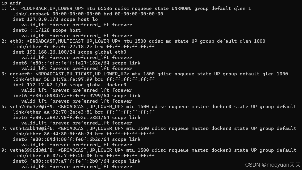 执行ip addr即可发现逃逸成功,此时网卡中你包括docker0的网卡。