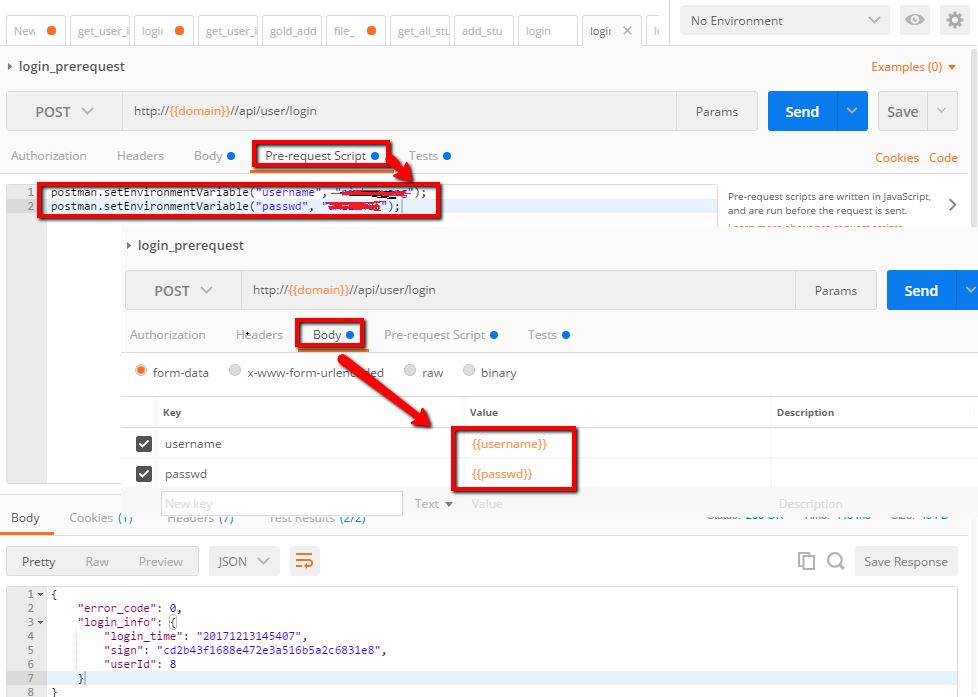 以login接口为例,在"Pre-requestScript"中设置环境变量 "username", "passwd",在Body 中选取"form-data" 格式,输入所需的key-value, value即为变量{{username}}, {{passwd}}。