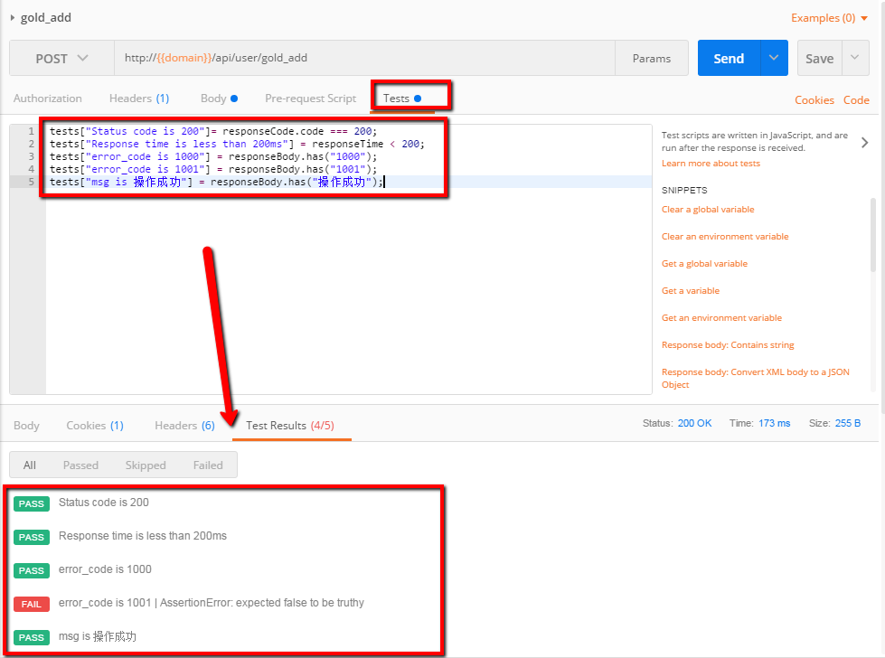 Tests 主要用来设计用例,比如要测试返回结果是否含有某一字符串,就可以用到 Tests。以gold_add 接口为例,来编写测试用例,分别测试返回的结果是否含有,如下所示: