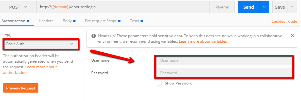 对于"Authorization"的使用,遇到比较多的是Type 为"Basic Auth", 然后设置对应的Username 和Password。