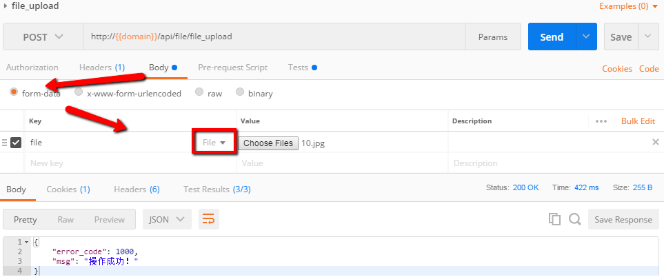 以file upload 接口为例,在Body 中选取"form-data" 格式,在key 里输入"file",在右边的下拉里选取类型为"File",点击"Choose Files" 就可以上传本地文件了。