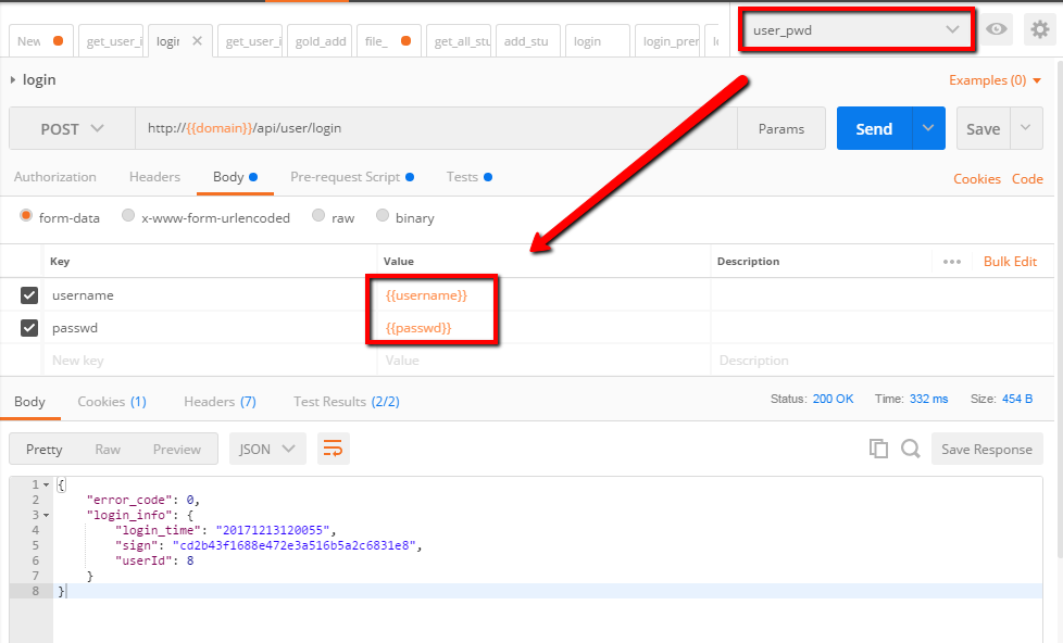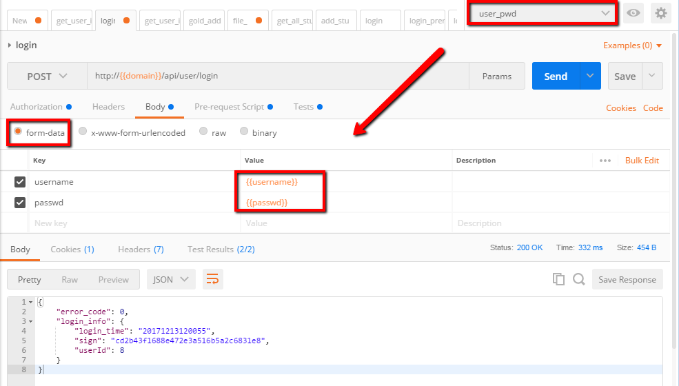 以login 接口为例,在Body 中选取"form-data" 格式,输入所需的key-value, 选取对应的环境变量。