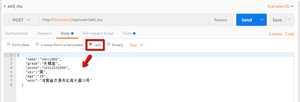 以add user 接口为例,在Body 中选取"raw" 格式,根据接口文档输入json 数据, 有需要应用环境变量的选取环境变量。