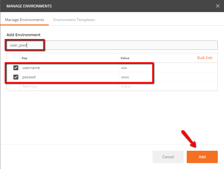 a. 环境变量的设置方法如下图。点击设置一个环境变量,名为"user_pwd", 里面设置username 和passwd的值,然后在请求中应用这个环境变量"user_pwd"即可。