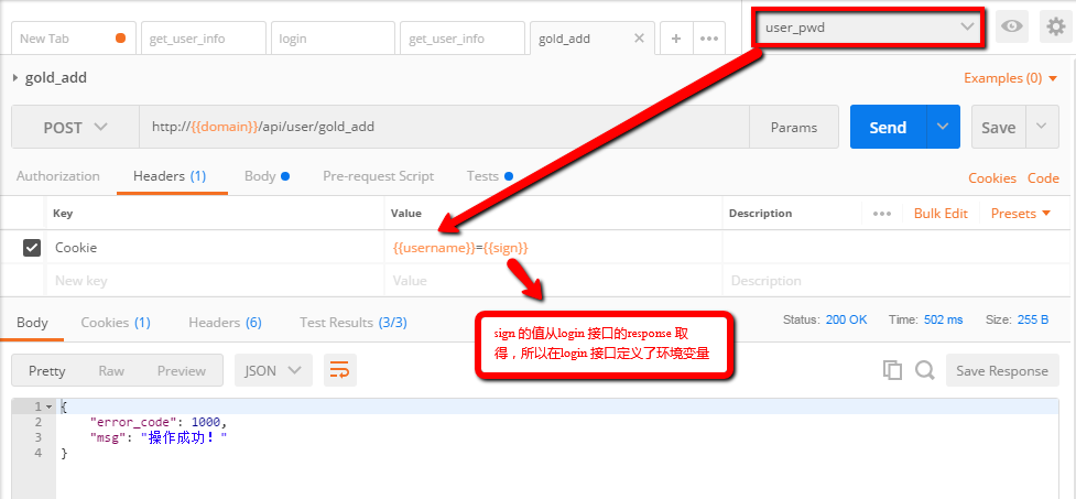 在gold_add 接口中,{{username}} 由于在环境变量"user_pwd" 中已经设置,可以直接输入变量名, {{sign}} 动态取得login接口中 Response 的 "sign" 值,{{sign}}已在上面login 请求的"Tests" 中定义。