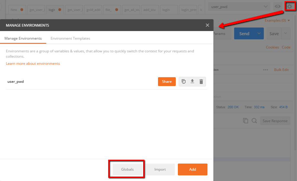 b. 全局变量的设置方法类似,如下图,点击"Globals" 后就会出现添加环境变量类似的页面,进行变量和值的设置。