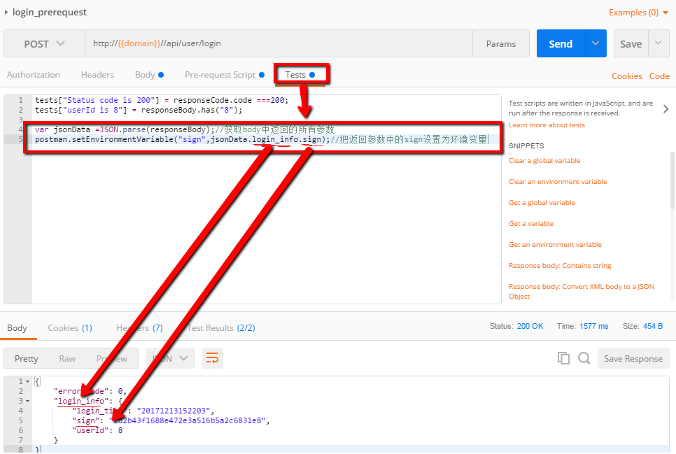postman.setEnvironmentVariable("sign",jsonData.login_info.sign);//把返回参数中的sign设置为环境变量