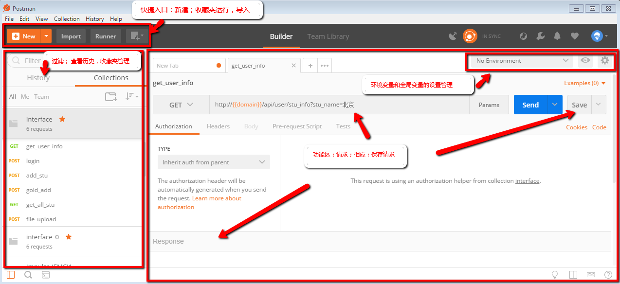 - 功能区: Request 请求设置,查看 Response 响应结果和测试结果,可以将请求保存到收藏夹。