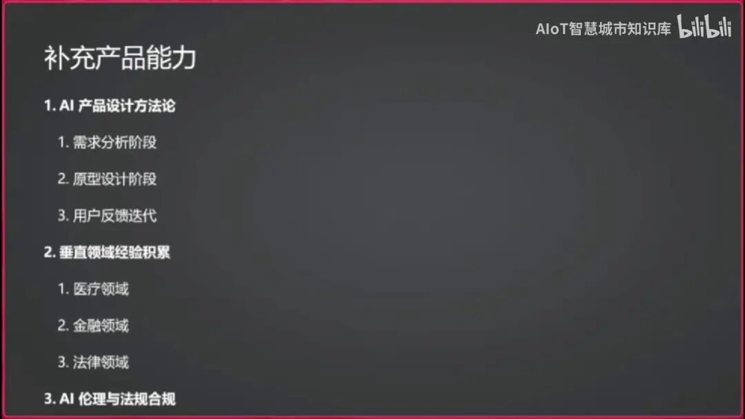 能够落地的价值在于,首先出发点要正确,目标要明确,这样大模型才能体现出其实际意义,而非沦为玩具。其次,需要补充项目能力。第三点,我想强调的是产品能力。许多伙伴开发的功能,无论是玩具还是演示项目,往往难以体现其核心价值。因此,我会在最后简要补充AI产品设计的方法论,包括需求分析阶段、原型设计阶段、用户反馈迭代等关键环节。