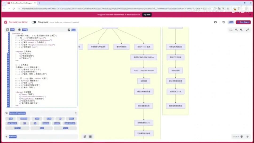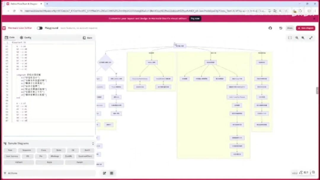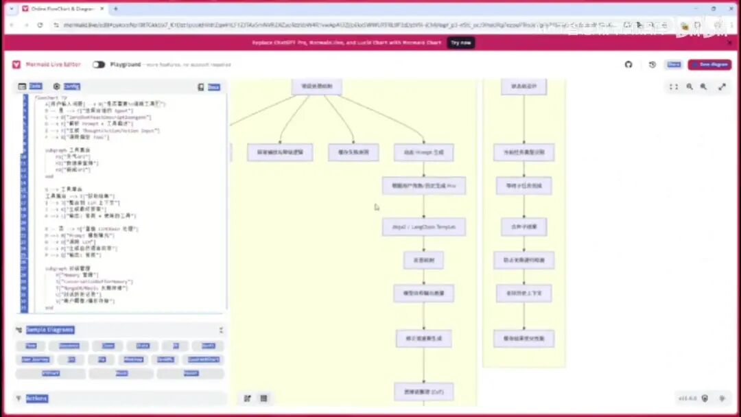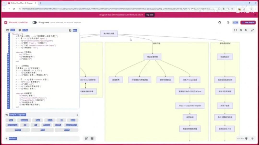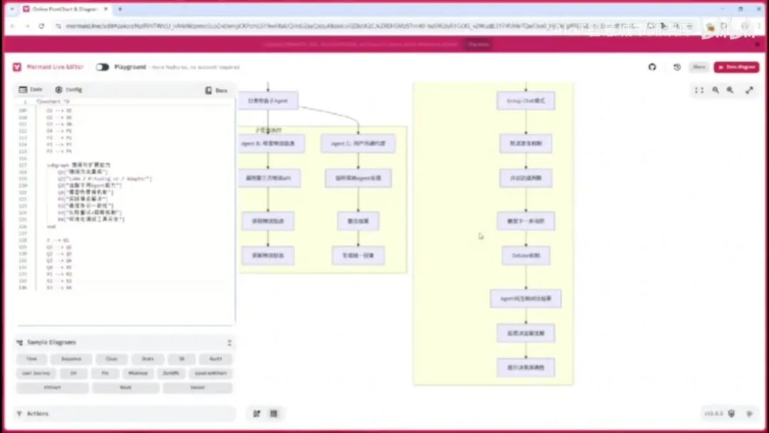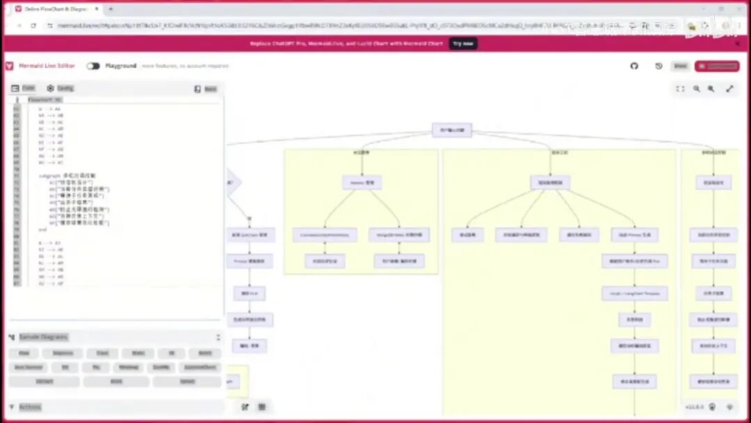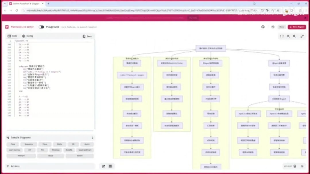 此次,大模型才真正发挥了作用。我通过 Mermaid Live Editor 绘制了这一架构图。现在我们可以放大查看。左侧部分无法收起,因此我们直接使用这一部分。接下来,我们可以采取以下措施。