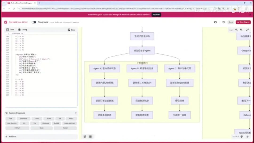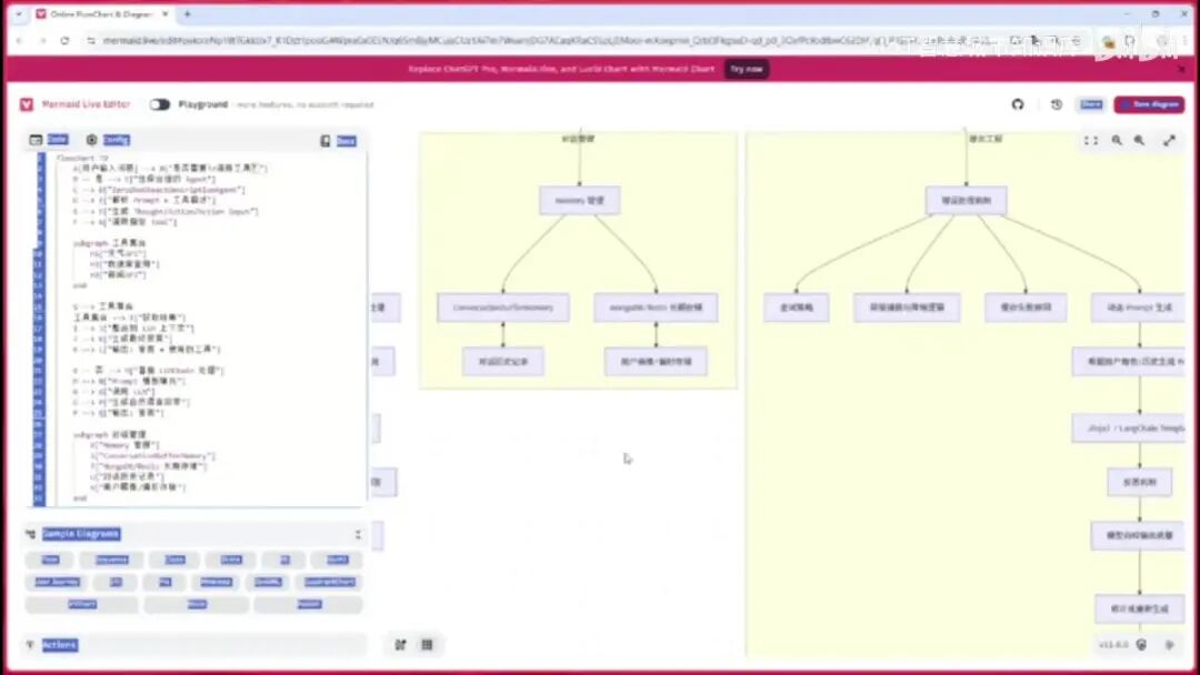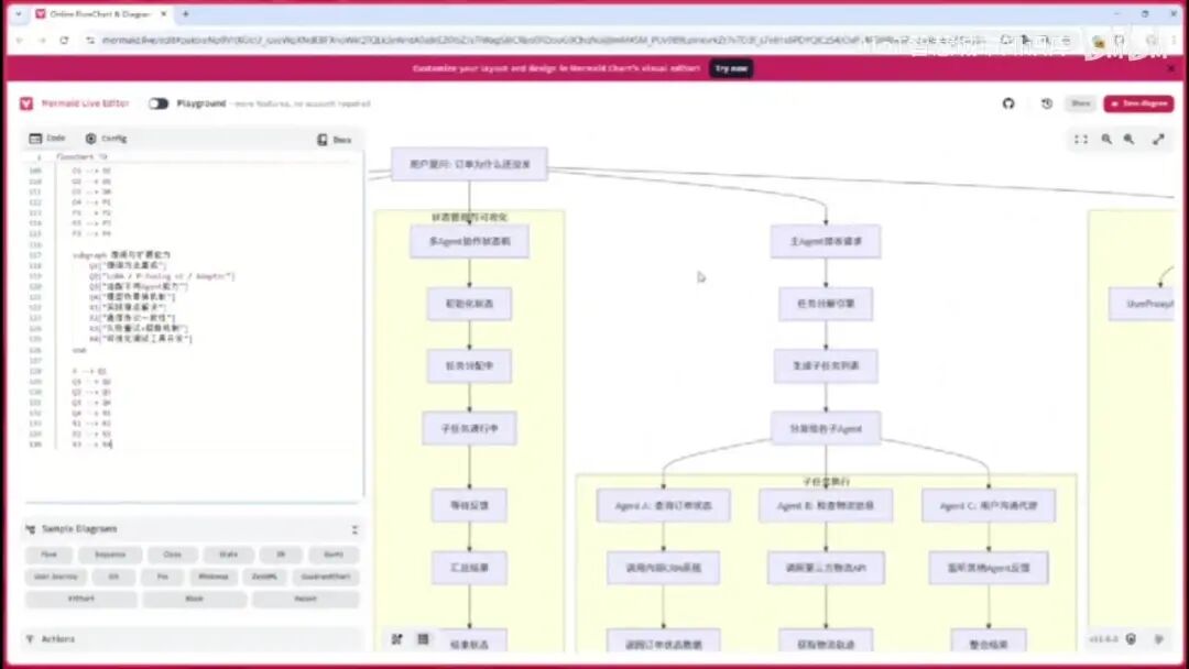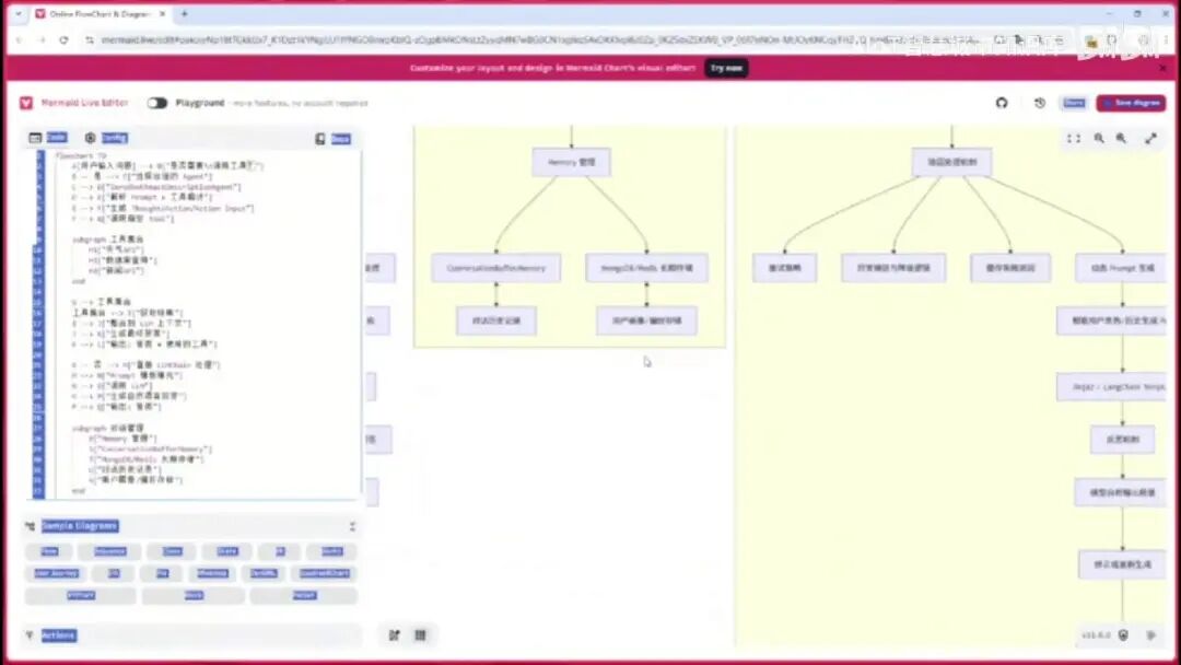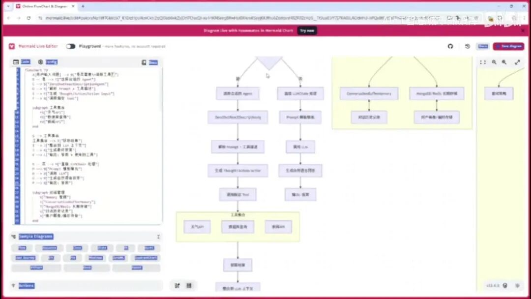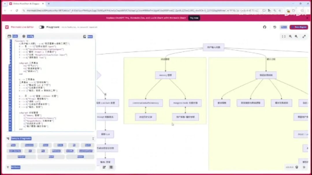 此次,大模型才真正发挥了作用。我通过 Mermaid Live Editor 绘制了这一架构图。现在我们可以放大查看。左侧部分无法收起,因此我们直接使用这一部分。接下来,我们可以采取以下措施。