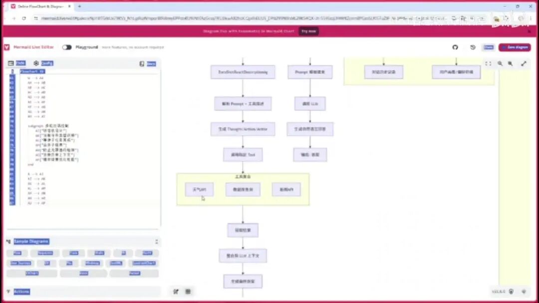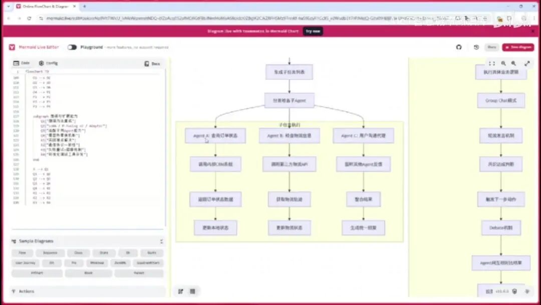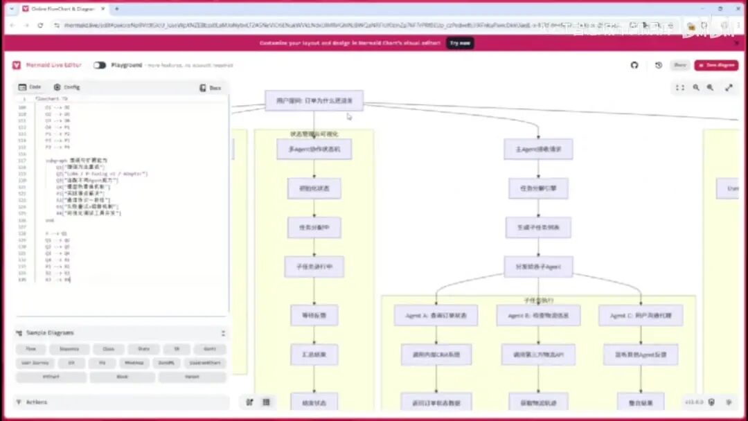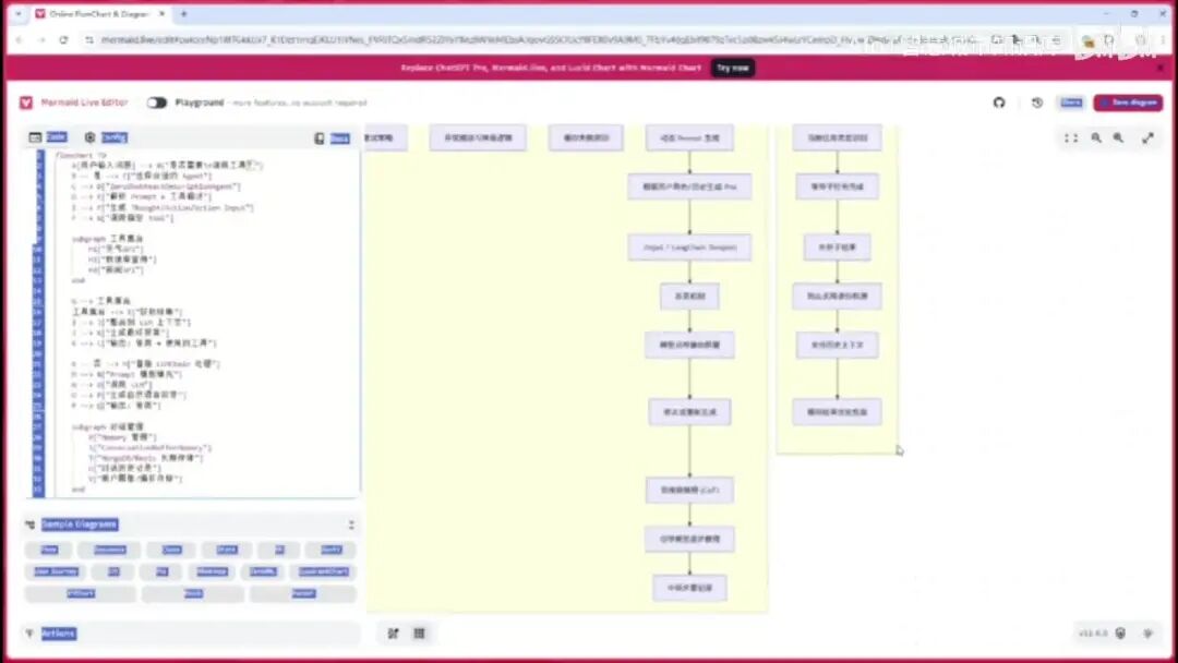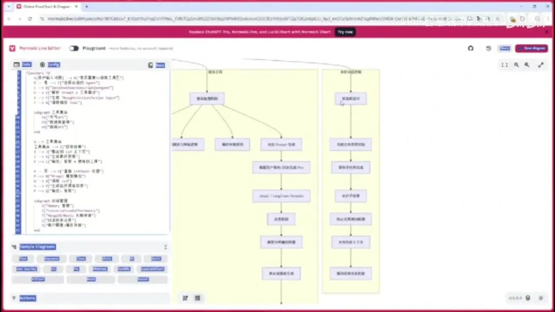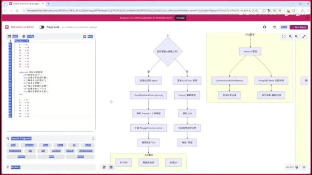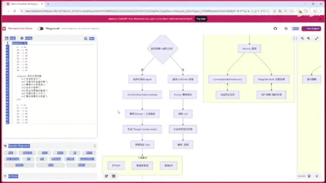 此次,大模型才真正发挥了作用。我通过 Mermaid Live Editor 绘制了这一架构图。现在我们可以放大查看。左侧部分无法收起,因此我们直接使用这一部分。接下来,我们可以采取以下措施。