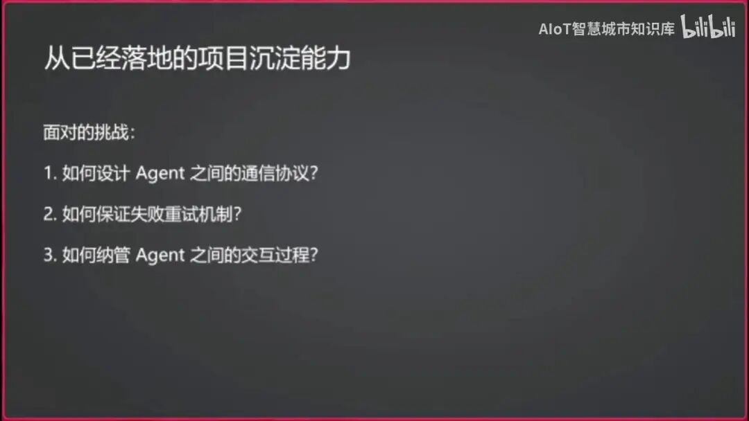 接下来我将详细阐述企业智能体(Agent)所面临的挑战。正如刚才同学提到的,首要挑战是Agent之间的通信问题。具体而言,如何确保失败重试机制的有效性?包括重试次数的设定。