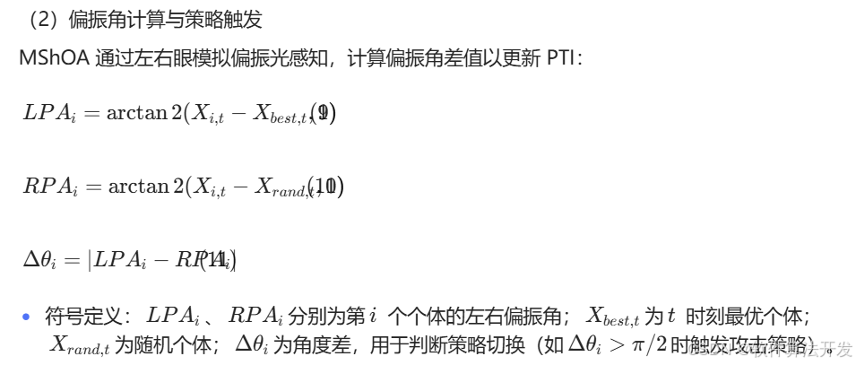 MShOA的优化过程分为初始化、偏振类型判断、行为策略执行三大步骤,核心数学公式如下: