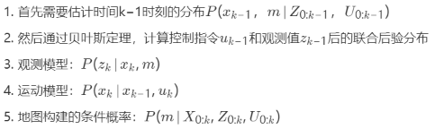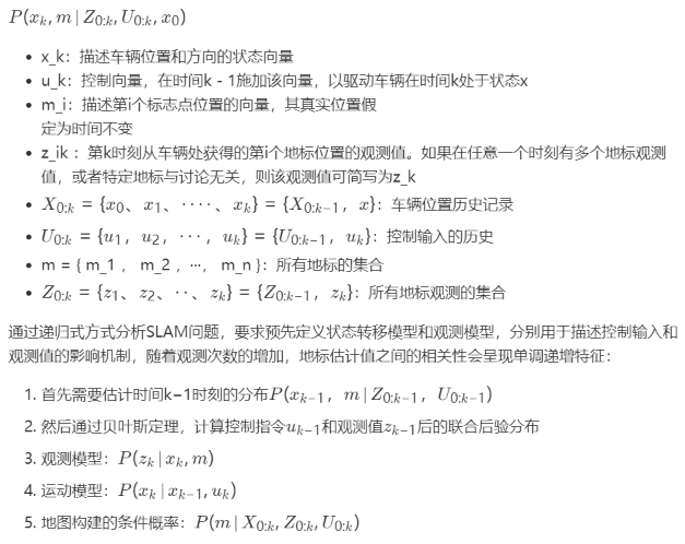 在SLAM中,平台的运动轨迹和所有地标的位置都可以在线估算,而不需要任何先验位置信息,相当于求一下概率分布,计算所有时间点k的概率分布,描述了在已知截至时间k及之前的观测数据、控制输入k−1以及车辆初始状态的前提下,地标位置与车辆状态的联合后验概率: