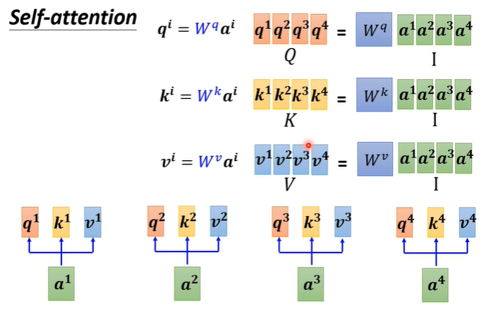 从矩阵角度来看Self attention关联度的计算,我们知道每个输入都需要产生q,k,v三个向量,我们将所有输入a合并视为一个矩阵I,将矩阵I与对应的矩阵相乘就能得到由q,k,v三种向量组成的矩阵Q,V,K。
