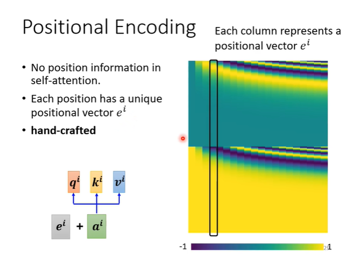 在Self attention中,我们并没有任何相关的位置资讯,有时位置可能会很重要,例如词性标注时,动词不太会出现在句首等,如果我们想在Self attention中加入位置资讯,就要用到Positional encoding。