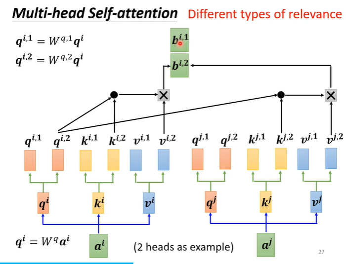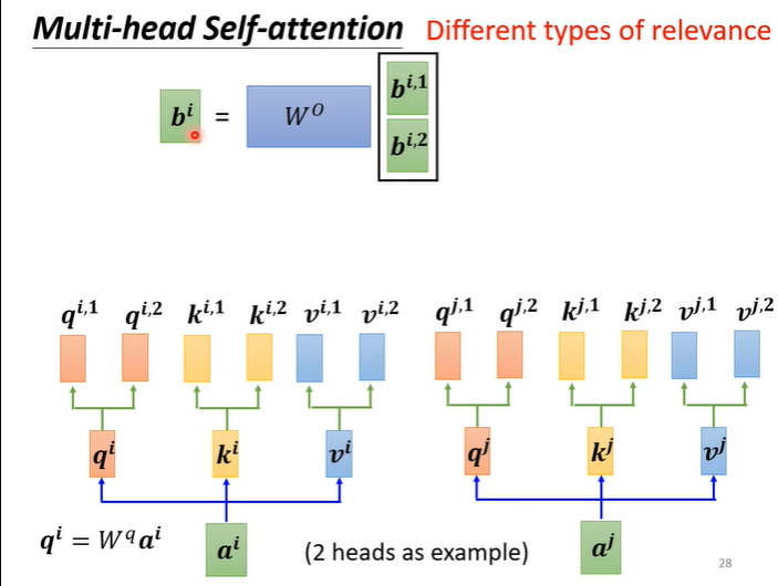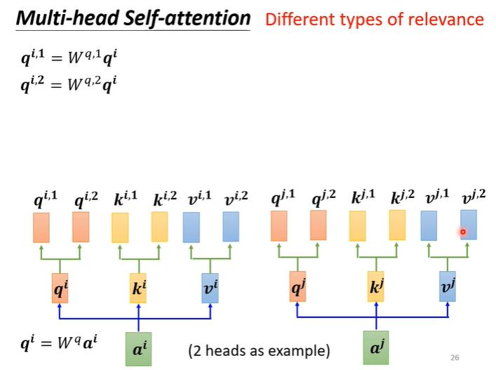 Self attention还有一个进阶的版本叫Multi-head Self attention,需要多少head也是一个我们需要训练的一个参数,为什么我们会需要较多的head呢?因为相关这种事情有很多不同的形式,在Self attention中我们用q找相关的k,也许我们不能只有一个q,不同的q负责不同的相关性。
