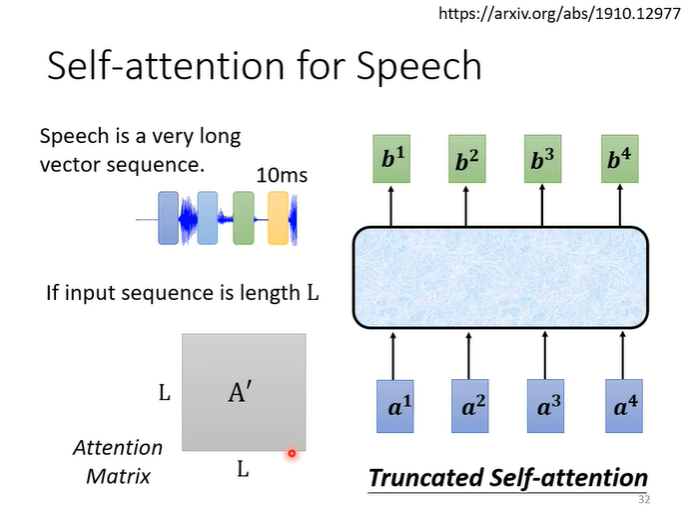 self attention也可以用于语音辨识,但是有一个问题就是,一个向量能表示的语音非常短,一秒的语音可能要100个向量,这会导致相关性矩阵非常大,不仅计算量很大,存储也需要很大的空间。所以就有了Truncated self attention,在做语音辨识的时候不看整句话,看部分即可,范围由自己设定。
