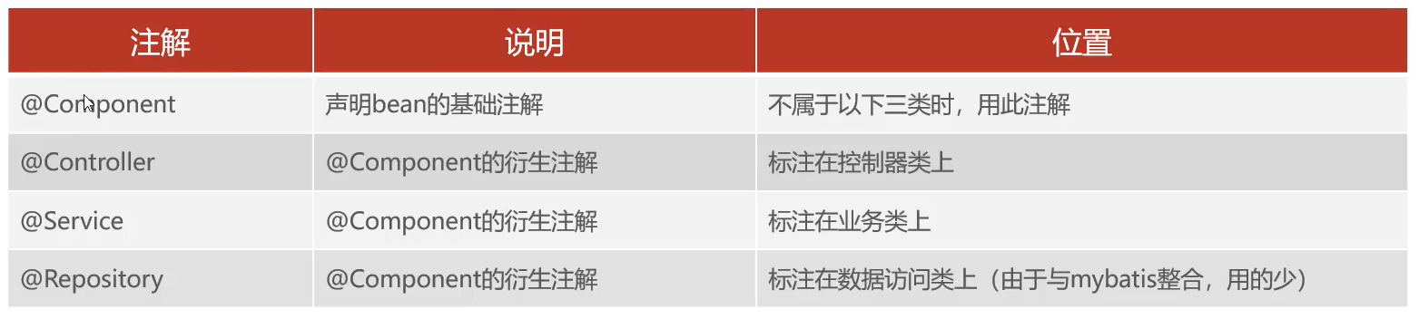 2、使用以上四个注解都可以声明bean,但是在springboot集成web开发中,声明控制器bean只能用@controller