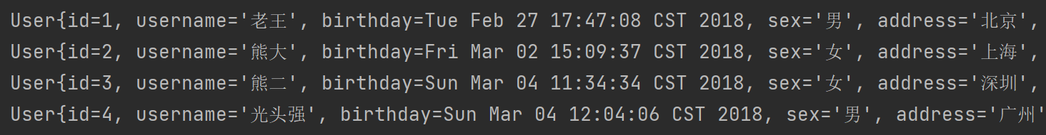 private static final long serialVersionUID = 525400707336671154L;private Integer id;private String username;private Date birthday;private String sex;private String address;public Integer getId() {return id;}public void setId(Integer id) {this.id = id;}public String getUsername() {return username;}public void setUsername(String username) {this.username = username;}public Date getBirthday() {return birthday;}public void setBirthday(Date birthday) {this.birthday = birthday;}public String getSex() {return sex;}public void setSex(String sex) {this.sex = sex;}public String getAddress() {return address;}public void setAddress(String address) {this.address = address;}@Overridepublic String toString() {return "User{" +"id=" + id +", username='" + username + '\'' +", birthday=" + birthday +", sex='" + sex + '\'' +", address='" + address + '\'' +'}';}