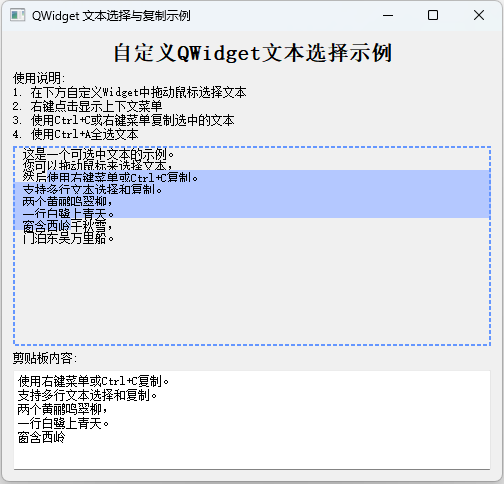 {setWindowFlags(Qt::Dialog |Qt::WindowMinMaxButtonsHint |Qt::WindowCloseButtonHint);setWindowTitle("QWidget 文本选择与复制示例");setMinimumSize(500, 400);QVBoxLayout *layout = new QVBoxLayout(this);QLabel *titleLabel = new QLabel("自定义QWidget文本选择示例");titleLabel->setTextInteractionFlags(Qt::TextSelectableByMouse); // 设置通过鼠标选中文本内容titleLabel->setAlignment(Qt::AlignCenter);QFont titleFont = titleLabel->font();titleFont.setPointSize(16);titleFont.setBold(true);titleLabel->setFont(titleFont);QLabel *instructionLabel = new QLabel("使用说明:\n""1. 在下方自定义Widget中拖动鼠标选择文本\n""2. 右键点击显示上下文菜单\n""3. 使用Ctrl+C或右键菜单复制选中的文本\n""4. 使用Ctrl+A全选文本");instructionLabel->setWordWrap(true);SelectableTextWidget *selectableWidget = new SelectableTextWidget;QTextEdit *outputEdit = new QTextEdit;outputEdit->setPlaceholderText("复制的内容将显示在这里...");outputEdit->setMaximumHeight(100);// 监听剪贴板变化QObject::connect(QApplication::clipboard(), &QClipboard::dataChanged, this, [outputEdit]() {outputEdit->setPlainText(QApplication::clipboard()->text());});layout->addWidget(titleLabel);layout->addWidget(instructionLabel);layout->addWidget(selectableWidget, 1);layout->addWidget(new QLabel("剪贴板内容:"));layout->addWidget(outputEdit);