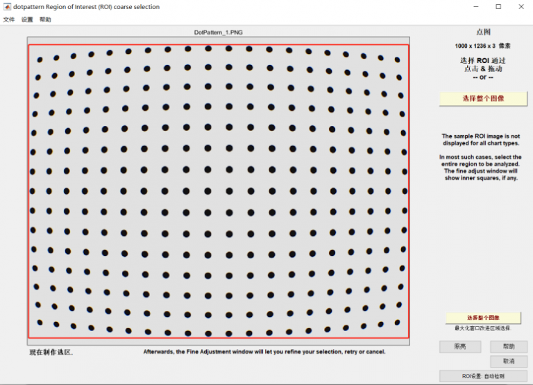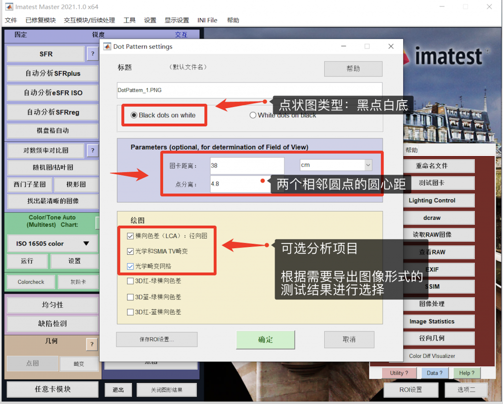 在Imatest Master软件中打开Dot Pattern模块(点图),导入需要分析的图片