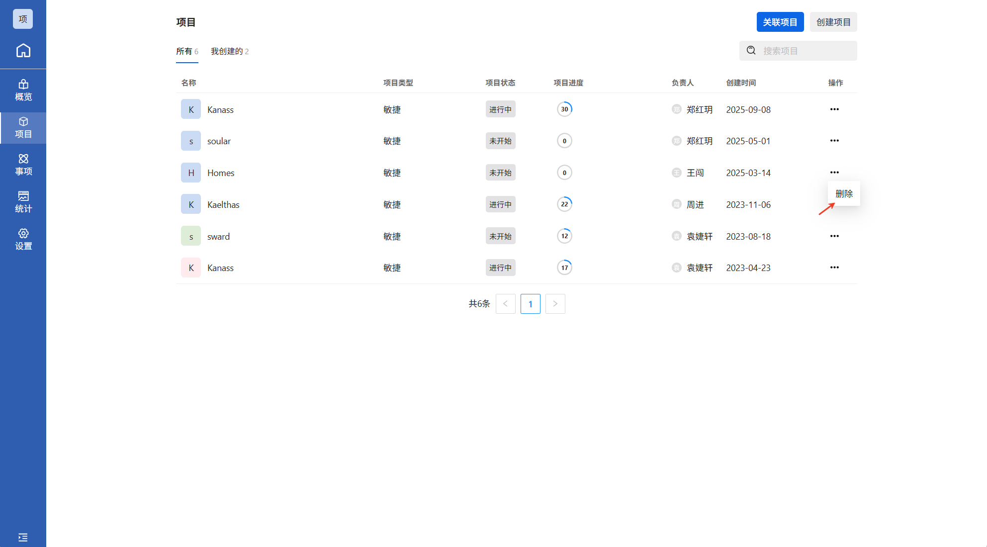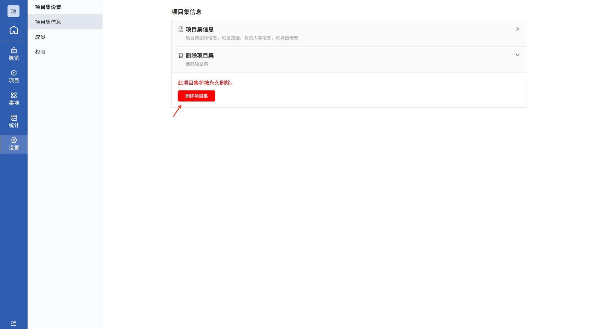 点击项目列表的更多->删除,可以解除项目与项目集的关联关系,不会将项目从系统中删除