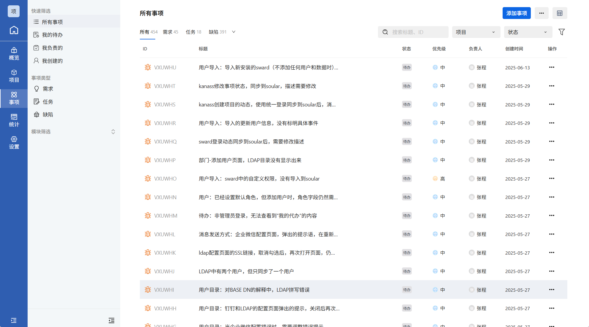 系统默认提供一些快捷筛选,如我的待办、我负责的、我创建的。同时提供事项类型的快捷筛选,如需求、任务、缺陷。