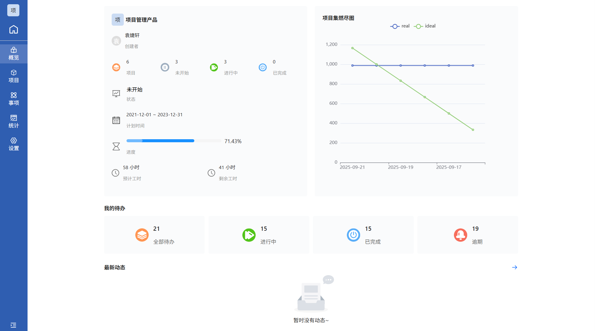点击左侧导航栏中概览,页面会详细展示出当前版本的项目集信息、进行中项目、我的待办、最新动态