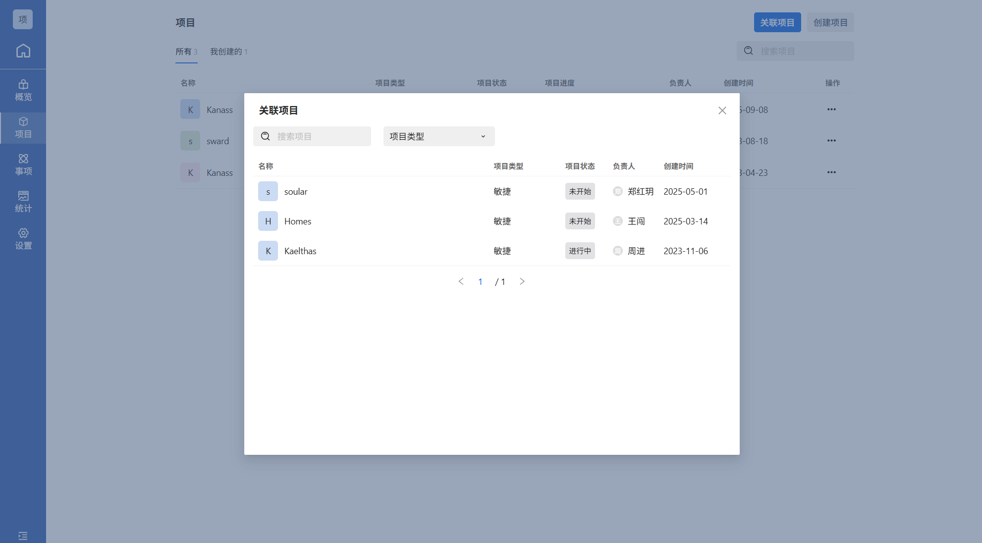 进入项目模块,点击关联项目,新窗口中会显示仍未关联的项目,点击即可关联。也可以通过项目类型或者项目名称进行搜索。