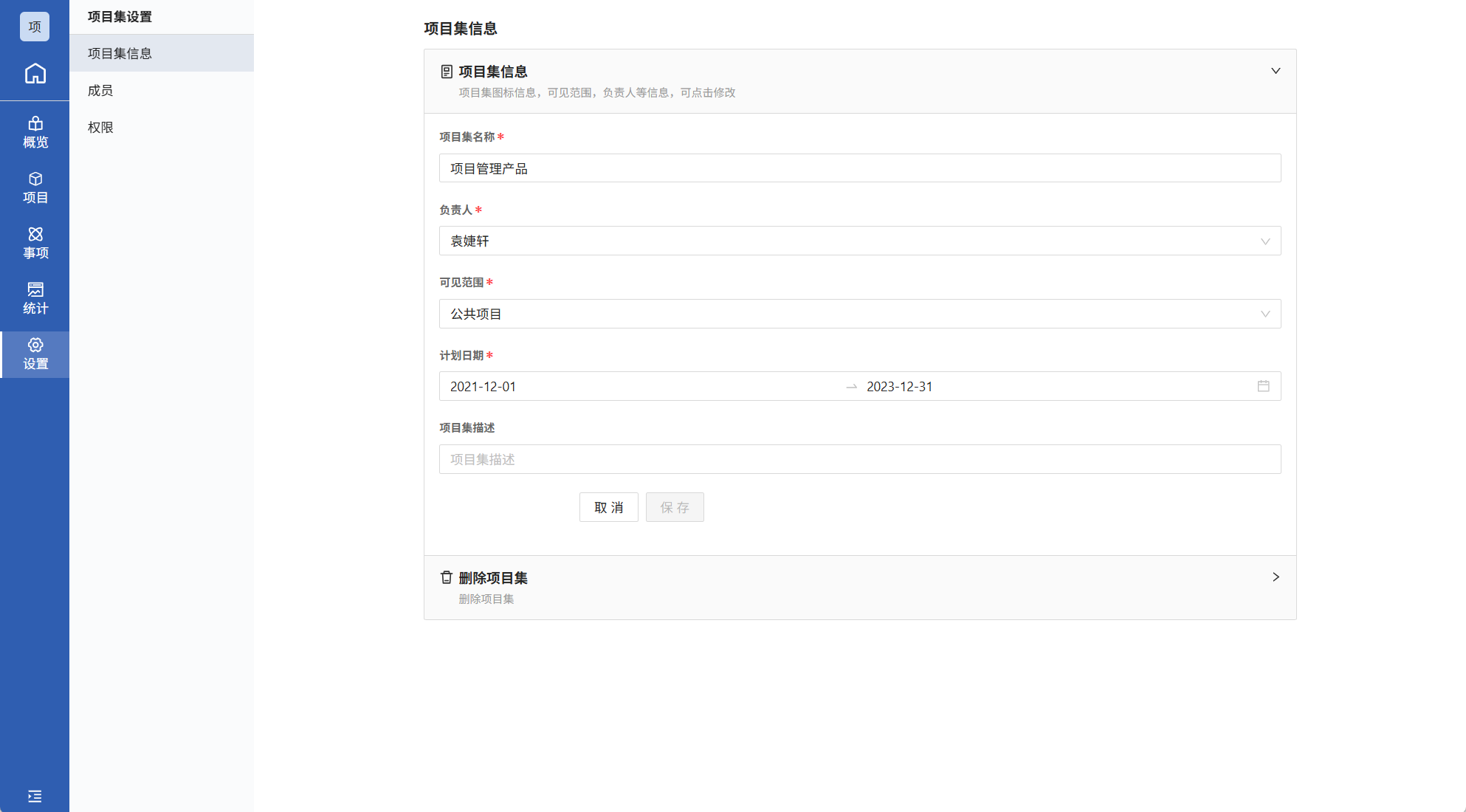计划日期 | 必填 | 设置当前项目集的开始与结束时间 |