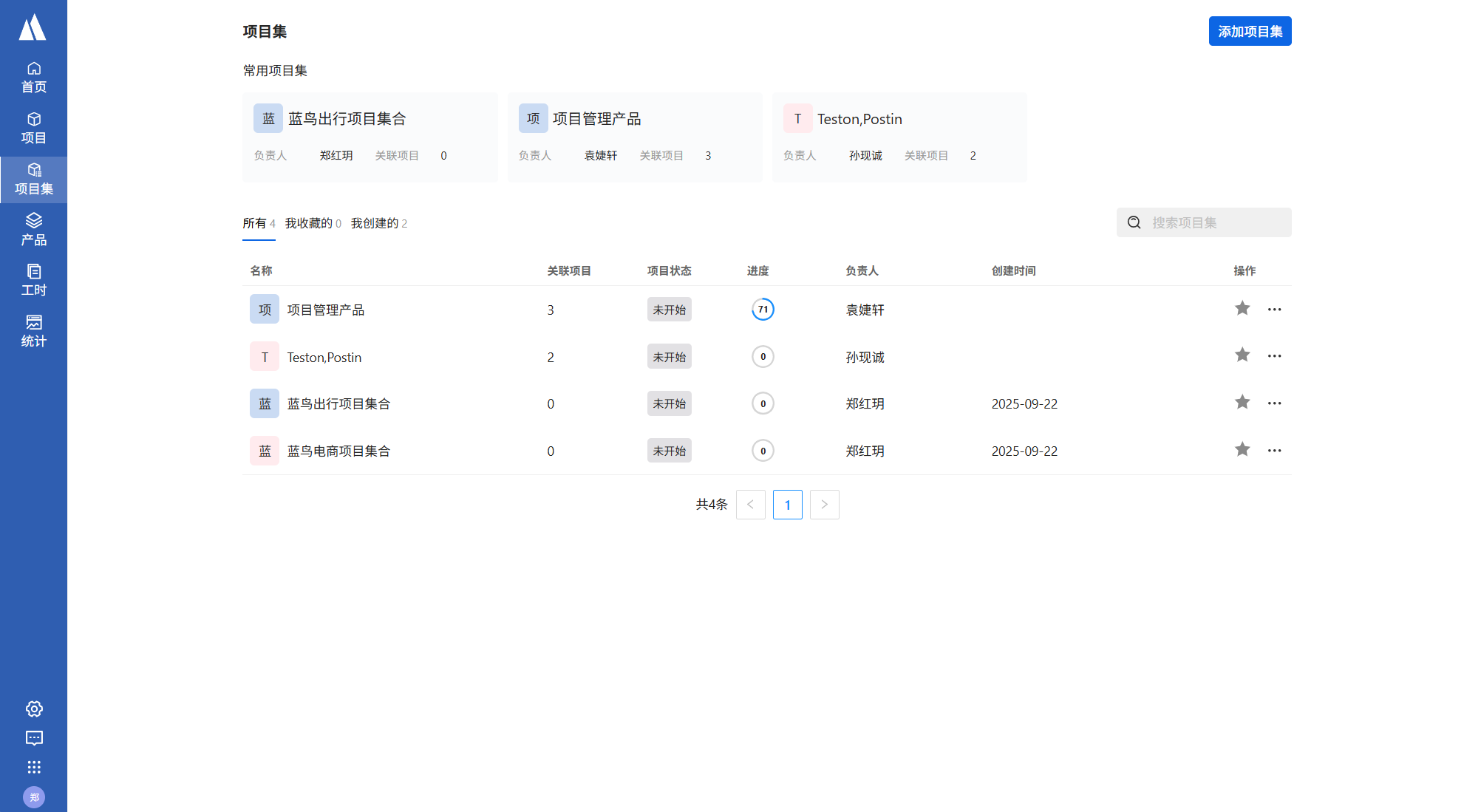 项目集列表页面,主要显示:常用项目集、所有项目集、我收藏的、我创建的