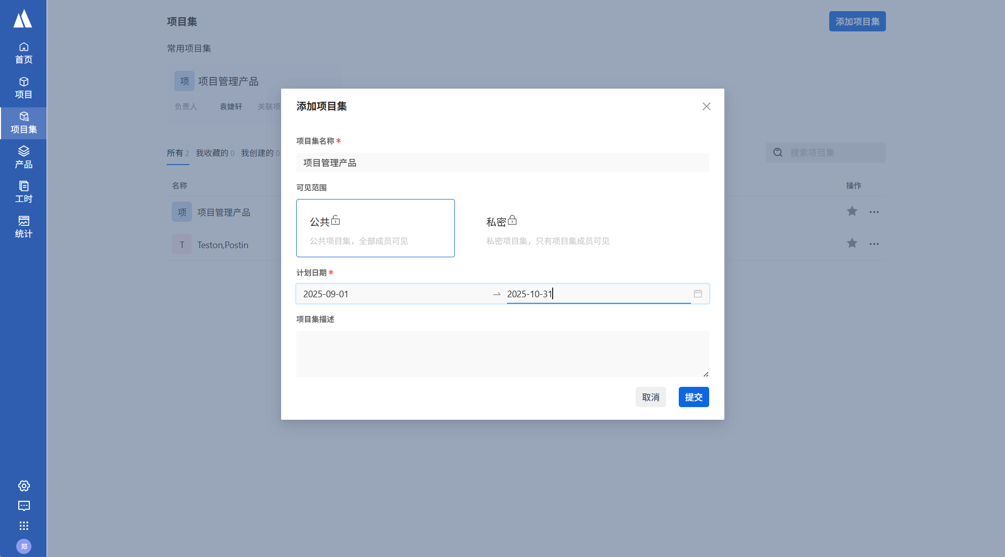 点击项目集->添加项目集,填写信息后点击提交,项目集添加成功,页面自动跳转到项目集列表页面。