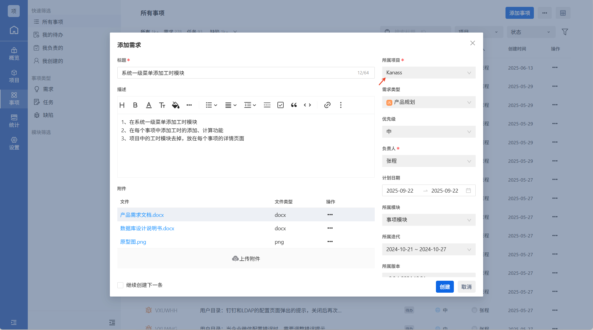 项目集中支持为已关联的项目添加事项,填写事项信息时,可以选择当前事项的所属项目。注:只能选择当前项目集所关联的项目。
