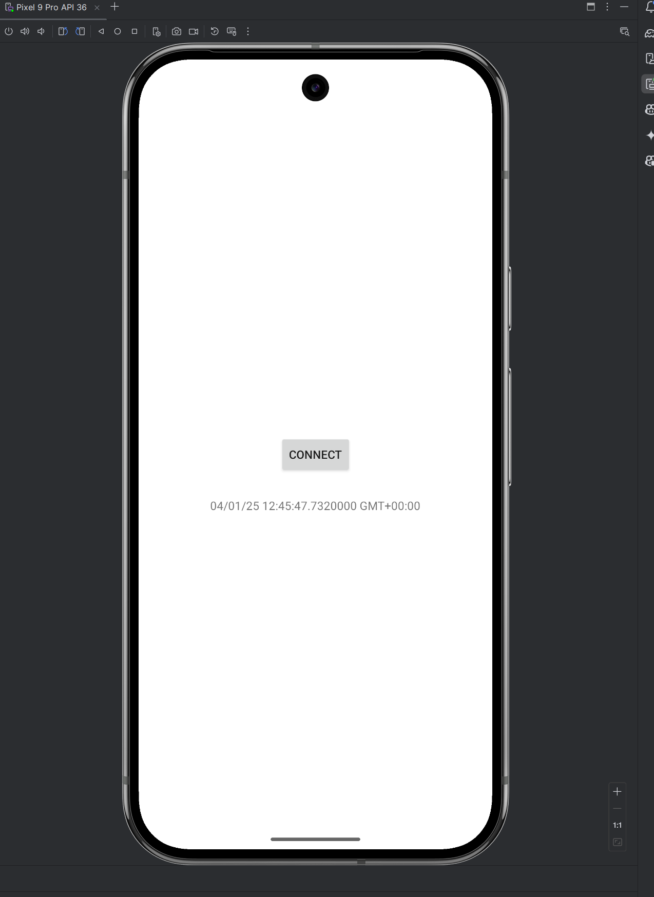可以使用Android Studio提供的设备模拟器运行此示例。创建一个具有匹配API级别的设备,运行Gradle Sync,然后在模拟设备上运行应用程序。在示例应用程序中,点击“连接”将尝试连接到指定的服务器并读取服务器时间戳值。读取成功后,时间戳值将显示在“连接”按钮下方。