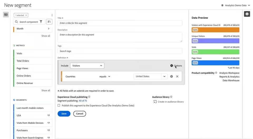 分群分析是 Adobe Analytics 最强大的功能之一。企业可以根据人口统计、行为或互动程度,将用户分成有意义的群体,而非一视同仁。