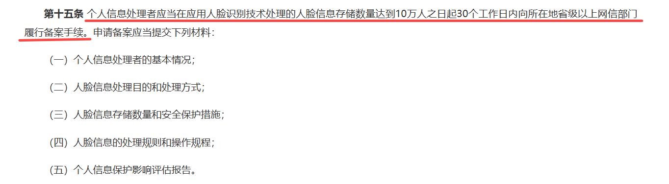 根据《人脸识别技术应用安全管理办法》规定,个人信息处理者应当在应用人脸识别技术处理的人脸信息存储数量达到10万人之日起30个工作日内向所在地省级以上网信部门履行备案手续。
