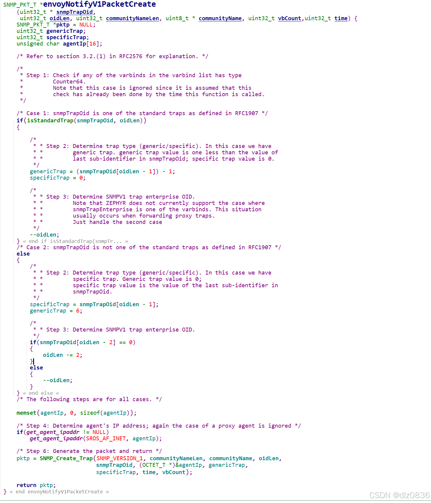 + --oidLen;}memset(agentIp, 0, sizeof(agentIp));if (get_agent_ipaddr(SROS_AF_INET, agentIp) != 0){/* fallback to 127.0.0.1 if failed */agentIp[0] = 127; agentIp[1] = 0; agentIp[2] = 0; agentIp[3] = 1;}pktp = SNMP_Create_Trap(SNMP_VERSION_1,communityNameLen,communityName,oidLen,snmpTrapOid,(OCTET_T *)agentIp,genericTrap,specificTrap,time,vbCount);return pktp;}