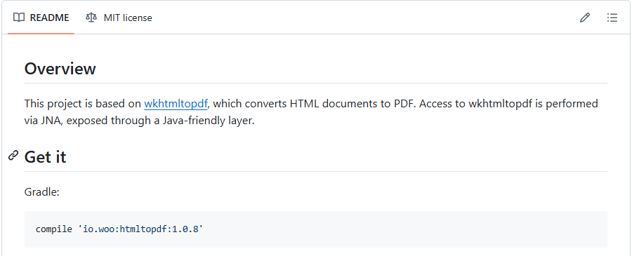 <dependency><groupId>io.woo</groupId><artifactId>htmltopdf</artifactId><version>1.0.4</version>