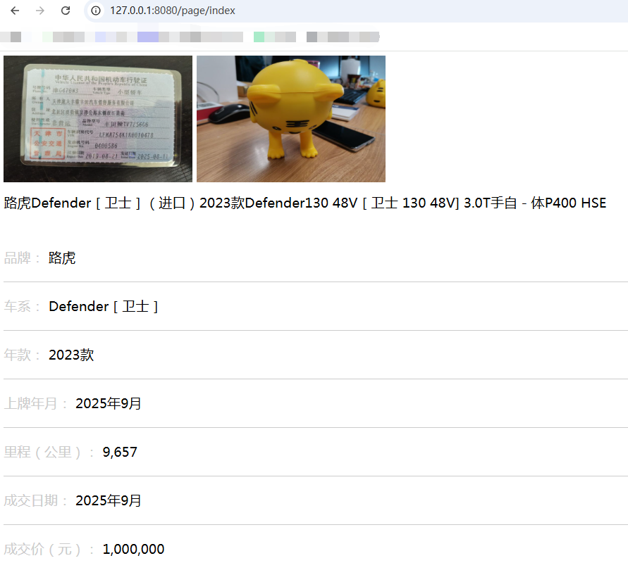 public String index(Model model) {List<Map<String, Object>> list = new ArrayList<>();for (int i = 0; i < 3; i++) {Map<String, Object> item = new HashMap<>();item.put("image1", "http://img.example.com/a.jpg");item.put("image2", "http://img.example.com/b.jp");item.put("vehicleName", "路虎Defender[卫士](进口)2023款Defender130 48V[卫士 130 48V] 3.0T手自-体P400 HSE");item.put("brandName", "路虎");item.put("seriesName", "Defender[卫士]");item.put("modelYear", "2023款");item.put("licenseYear", SDF.format(new Date()));item.put("displayMileage", DF.format(new BigDecimal("9657")));item.put("dealDate", SDF.format(new Date()));item.put("dealPrice", DF.format(new BigDecimal("1000000")));list.add(item);}model.addAttribute("list", list);return "index";
