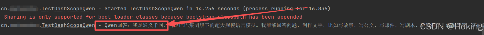 public class TestDashScopeQwen {@Autowiredprivate QwenChatModel qwenChatModel;@Testpublic void testDashScopeQwen(){String answer = qwenChatModel.chat("你是谁");log.info("Qwen回答: {}", answer);}}