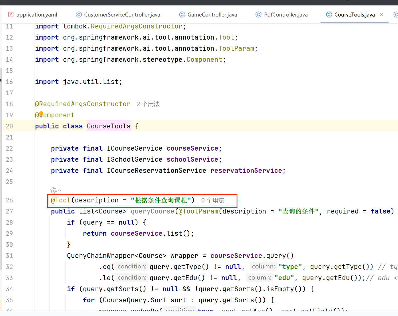 告知大模型某个方法的用途使用 Tool 注解即可,其他的和普通方法一样: