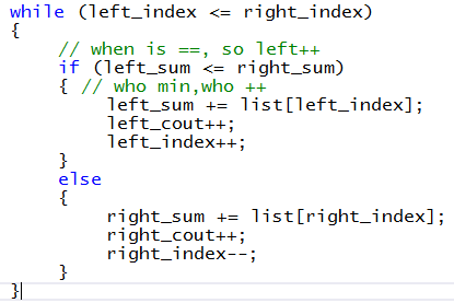 每个数字代表一个巧克力,而数字代表吃掉巧克力消耗的时间,当两个人消耗时间一样,就Alice先吃,但是一个巧克力不能分2不分吃。他们吃的速度一样,所以这里只要考虑时间之和sum就可以了。