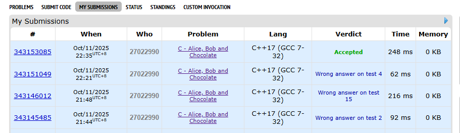 Codeforces Beta Round 6 C - Alice, Bob and Chocolate