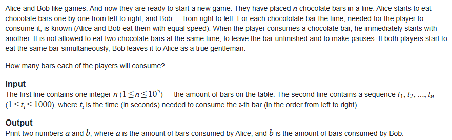{int n = 0, v1 = 0;cin >> n;if (n <= 0){return 0;}vector<int> list;for (int i = 0; i < n; i++){cin >> v1;list.push_back(v1);}// index=0 is already get!int left_index = 1;//while is from 1int right_index = n - 1 - 1; //while is from n-1-1int left_sum = 0, right_sum = 0;int left_cout = 0, right_cout = 0;//start from index=0left_sum += list[0];left_cout++;if (list.size() == 1){cout << "1 0" << endl;return 0;}right_sum += list[n - 1];right_cout++;while (left_index <= right_index){// when is ==, so left++if (left_sum <= right_sum){ // who min,who ++left_sum += list[left_index];left_cout++;left_index++;}else{right_sum += list[right_index];right_cout++;right_index--;}}cout << left_cout << " " << right_cout << endl;return 0;