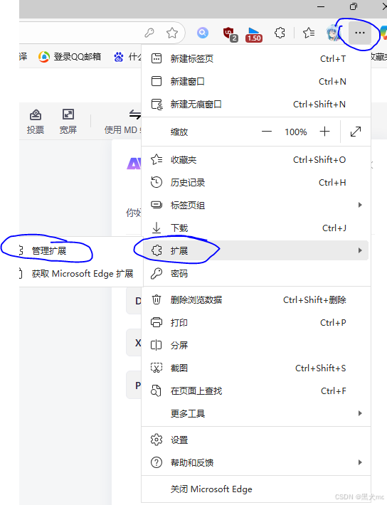 在管理页面底部,点击“获取Edge扩展”按钮,进入扩展商店。 -